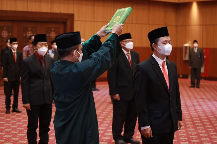 Prosesi pelantikan dan pengambilan sumpah jabatan berlangsung dengan protokol kesehatan secara ketat di Auditorium HM Rasjidi Kantor Kementerian Agama Jalan MH Thamrin Jakarta.